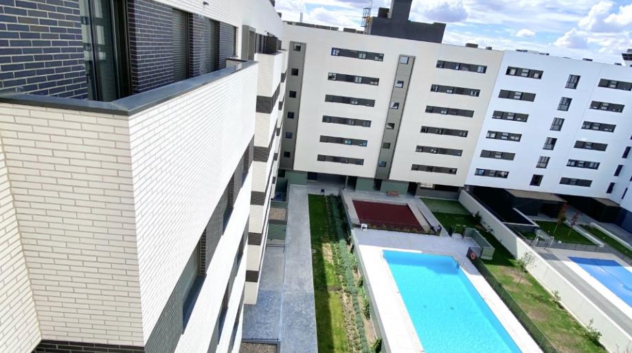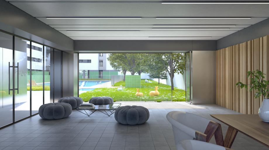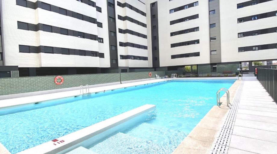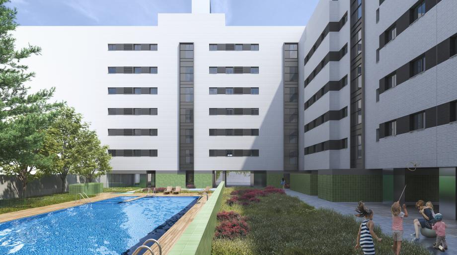 Urbanización cerrada con amplias zonas comunes que incluyen piscina, zona infantil acristalada y zona ajardinada.